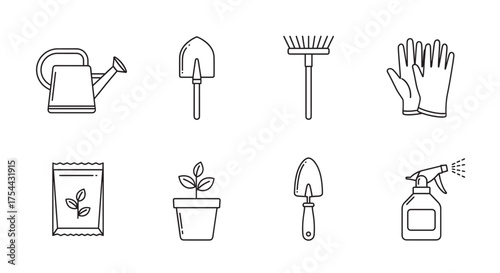 Gardening Outline Icon Set with Potted Plant, Fertilizer, Seeds and Gardening Gloves