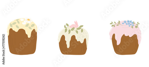 Easter cakes vector illustrations set. Cakes with icing and decorations.