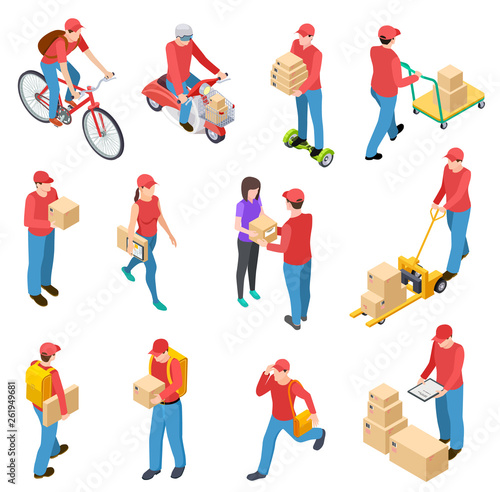 Delivery man. Service boy, courier package. Young postman on bike, male character with pizza. Employee holding box. Postal guys vector set. Box delivery, courier service, boy with package illustration