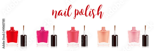 Set of realistic nail polish bottles on transparent background. Design element for cosmetic brand advertising poster