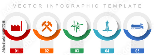 Industry and technology icon set, miscellaneous vector icons such as factory, mining, wind energy, oil and truck, modern design infographic template, web buttons in 5 color options