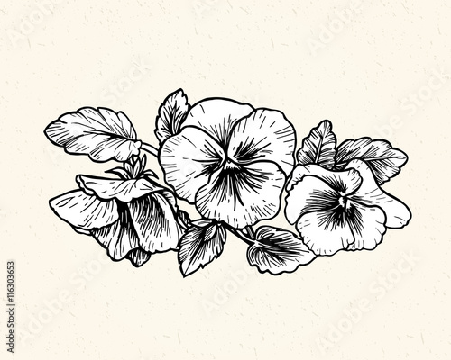 Coloring pages for children, Easy flowers art hand drawing Illustration sketch contour bouquet of artistic pansy flowers hand drawing pencil art, isolated Realistic flower coloring pages. simple pansy