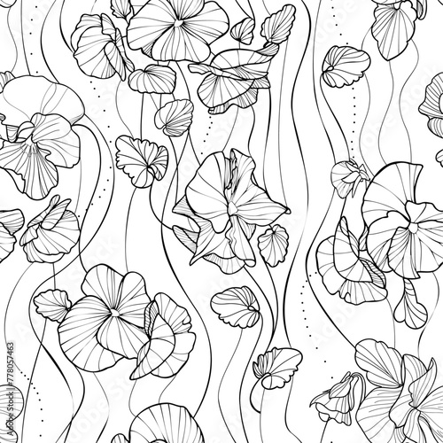 Hand drawn monochrome pansy flowers seamless brush. Floral endless border. Isolated on white background. Vector illustration.