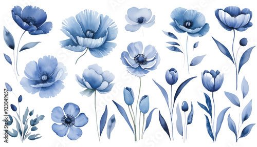 Watercolor set of different peony, orchid, primrose, flowers. Hand drawn flower vector illustration isolated on white background.