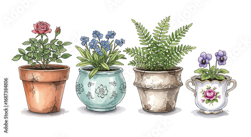 Decorations set with pansy. Colorful pansy with leaves in the wooden flower pot, standing and hanging. Cute vignette, ornament, corner decor. Vector illustration.