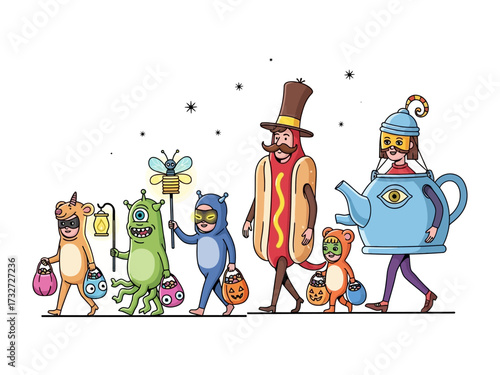 Illustration of children in halloween costumes walking in a parade with pumpkin decorations and bushes around them