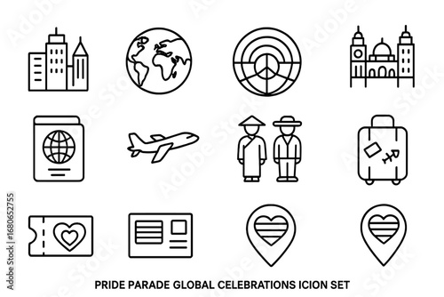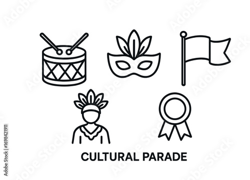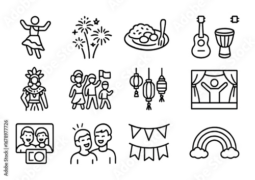 Colombian & Peruvian Icons. Outline icon set of Colombian festivals: carnival mask, flower festival, fireworks, traditional hat, drum, dancing shoes, parade,