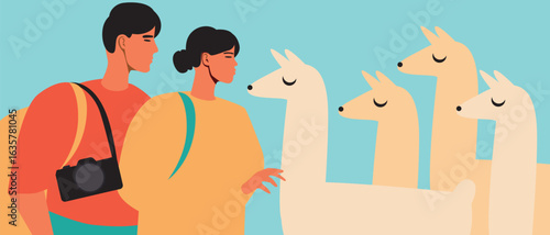 Asian couple with alpaca as latin america or peru travel concept, flat vector stock illustration for alpaca day