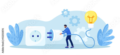 Vector of a businessman with electrical cord and bright idea light bulb plugging to power socket.