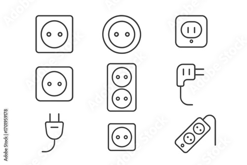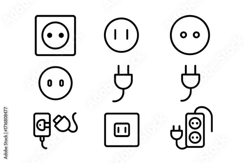 Electrical socket set icon. Power outlet, plug types, international sockets, electricity, home appliance, voltage, connection, electrical safety, infrastructure, current, household electronics