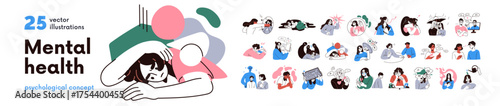 Mental health web icons in line style. Depression, psychotherapy, psychological, bipolar, negative thinking, obsession, collection. Vector illustration.
