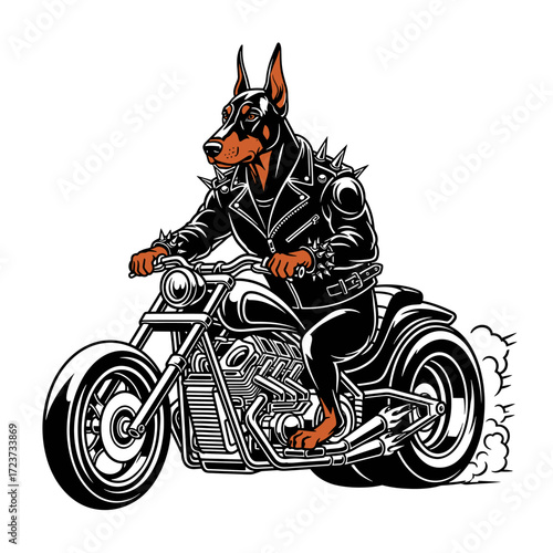 Intense snarling doberman with spiked collar and chain in high contrast black and white art