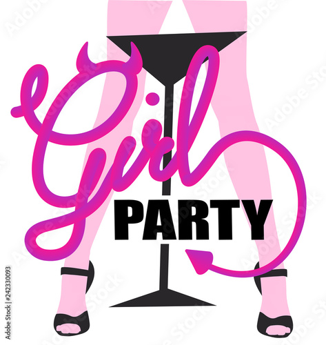 GIRLS PARTY BANNER WITH DEVIL STYLE LETTERING AND WOMAN'S LEGS ON THE BACKGROUND. VECTOR ILLUSTRATION