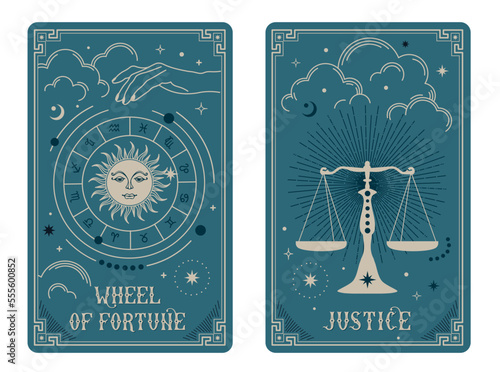 Wheel of fortune and Justice tarot card illustration fortune telling occult mystic esoteric. Celestial Tarot Cards Basic witch tarot