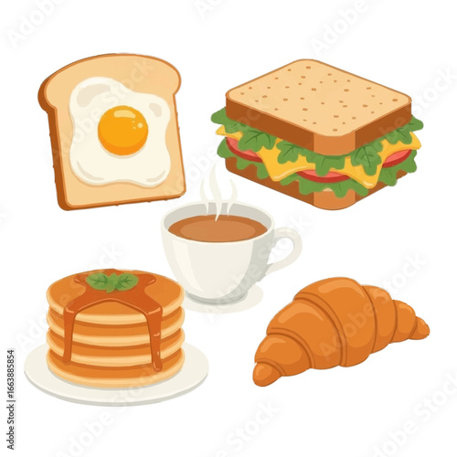 3d render breakfast food elements in minimal cute modern style. Pancake, avocado, egg, toast, sandwich, croissant, milk with cookies, coffee, frying pan. Set bright realistic vector illustration.