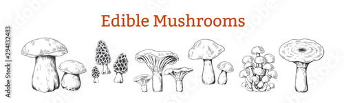 Sketch set champignon mushrooms, engraving. black and white line art. vector isolated on white background