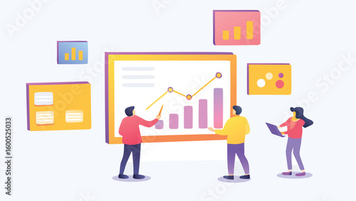 Team analyzing a growth chart on a board with additional charts and graphs around the presentation 100