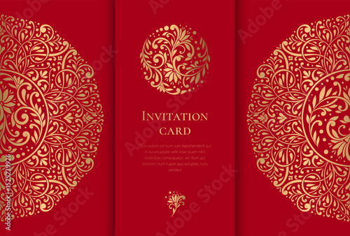 Royal red wedding invitation card design with golden mandala and abstract pattern