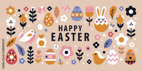 Vector festive clip art of cute white Easter Bunnies, Easter eggs, chicks and spring flowers on green background. Happy Easter greeting card, poster, banner template.