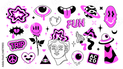 Vector Psychedelic Art stickers in Y2k style. Cartoon psyhedelic mushroom, UFO beam , liquid eye, Apollo head. Abstract surrealism sticker. set Psychedelic elemets for t-shirt print design