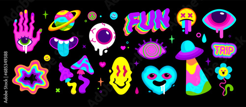 Vector Psychedelic Art, acid colors and surreal stickers 2. Cartoon psyhedelic mushroom, UFO beam , liquid eye, acid. Abstract surrealism bright sticker. Holutination trip set for badge and patch dsgn