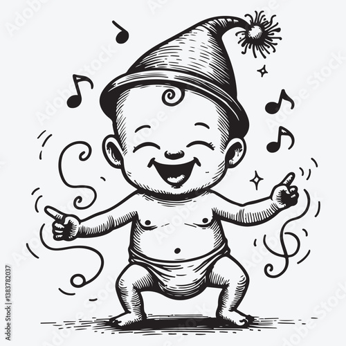 Adorable cartoon baby wearing a "YUM" bib, happily holding a spoon and fork, with a steaming cup nearby, ready for mealtime and eating.