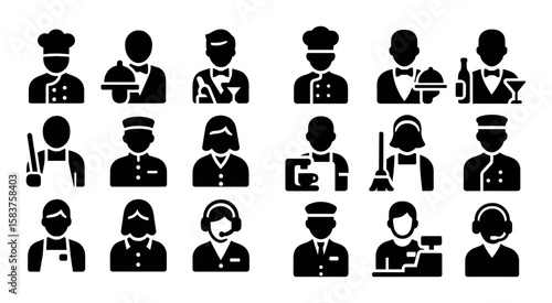 Solid style icons of hospitality and tourism jobs: hotel receptionist, concierge bell, tour guide icon, travel agent, housekeeper icon, resort manager, luggage porter, guest services badge.