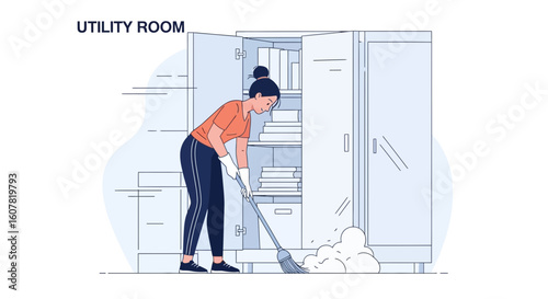 A woman, possibly a housekeeper or a maid, sweeping with a broom