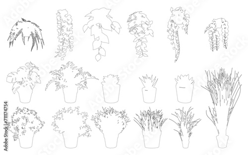 Set of trees elements in cad drawing, minimal line art, landscape symbol, vector illustration, background architecture, foliage outline, modern trees, linework, cutout.