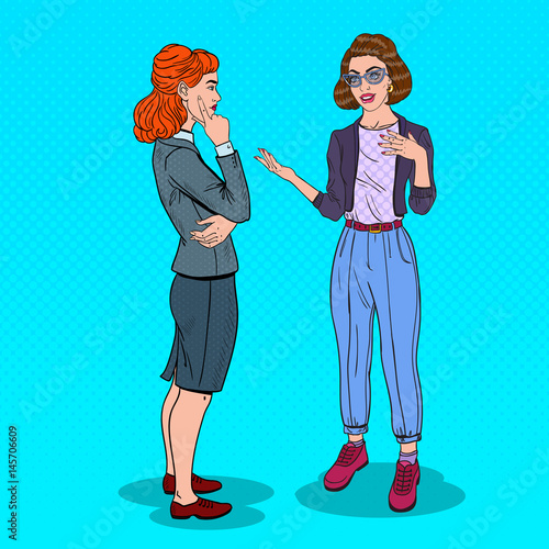 woman whispering gossip in woman ear pinup pop art retro vector illustration. Comic book style imitation.