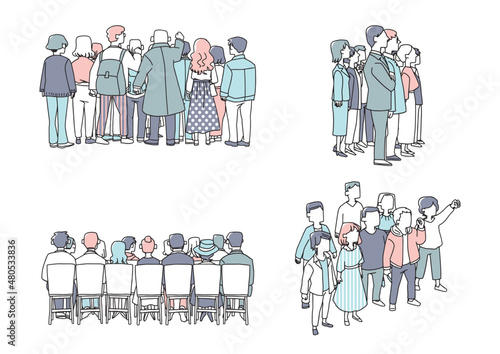 Crowd of people sitting and standing in audience. Rear view of academic auditorium, fan audience, people crowd. Set of spectators backs. Backside of people characters. Men women on concert or festival