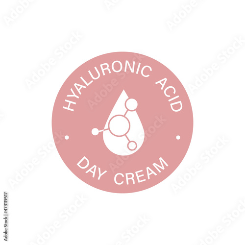 The icon of hyaluronic acid. The symbol of a day cream for cosmetics. Pink round sticker icon isolated on white background