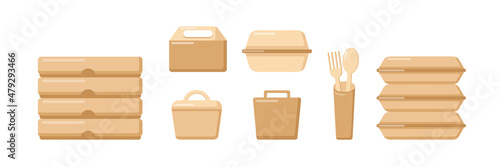 Empty close and open lunchbox for school or office dinner. Cartoon vector illustration set of plastic, glass and wooden box for food for lunch break. Childish eco bento package. Container for meal.