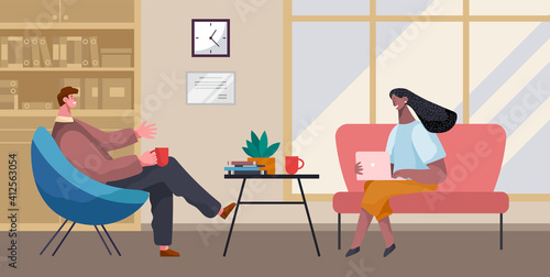 Businesswoman and businessman talking, drinking coffee, tea break time in office workspace with laptop. Employees colleagues use coffee break to maintain friendly conversations and rest from work