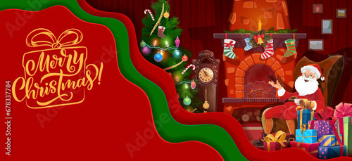 Christmas paper cut santa near holiday fireplace and decorated pine tree. Vector 3d effect greeting card with layered frame, Father Noel relax on chair at home in festive night. Xmas eve celebration