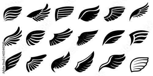 Wing vector. Wing icon set. Wings icon, Wings icons set. Set of black wings icons. Wings badges. Flat wings vector icon set. Wings icon collection.