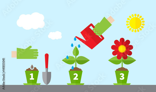 Flower growth process. Seedling, watering and gardening flowers phases. Stage of sprout growing into blossom plant in pot vector infographic