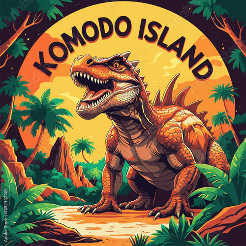 Komodo dragon brown tongue out walking position