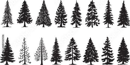 Collection of diverse evergreen coniferous forest tree silhouettes, artistic representation of woodland landscapes