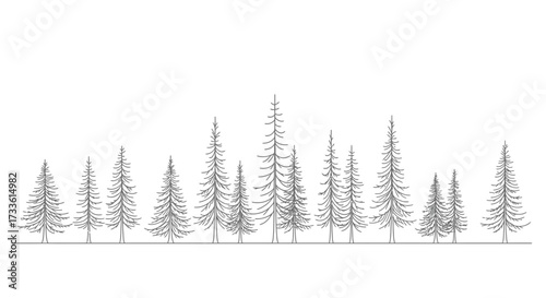Silhouette of coniferous trees against a white background, featuring various sizes and densities of pine and spruce trees
