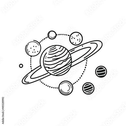 A simple outline illustration of a planet with rings in minimalist vector style, ideal for educational materials or space-themed designs