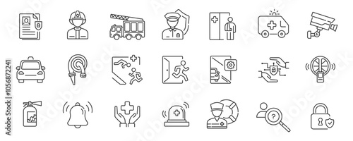 Vector Collection of Firefighter and Fire Emergency Service Icons. Modern Flat Line Art Symbols for Public Safety and Rescue