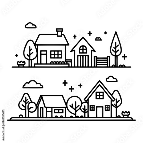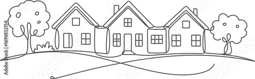 Charming row of simple houses with trees on a gentle hill, drawn with a single line.