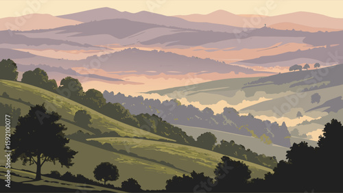 Scenic landscape painting of rolling hills at sunset with trees and distant mountains artwork illustration