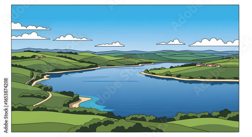 Expansive Blue Lake Amidst Green Rolling Hills Under a Clear Sky with Sparse Clouds in a Pixelated Retro Style
