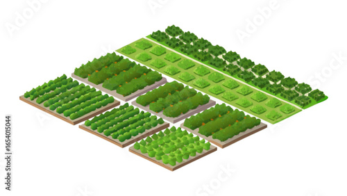 Isometric farm landscape illustration showing agriculture fields and crop cultivation for food production
