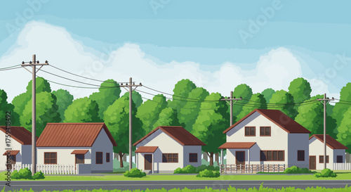 A serene suburban neighborhood scene featuring white houses with brown roofs, lined by green trees and power lines under a blue sky with clouds.