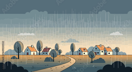 Peaceful Village Under Refreshing Rainfall Landscape Illustration Background