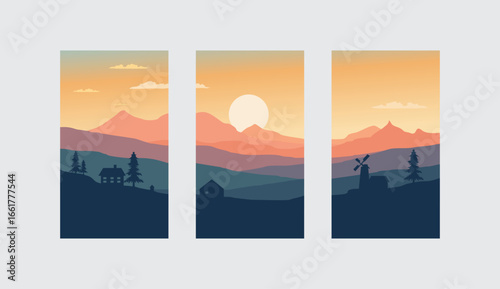 Minimalist countryside landscape with mountain ranges graphic illustrated have blank space.