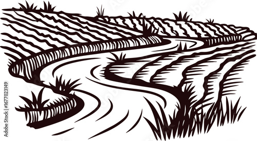 Curved rural pathway passing through stylized terraced fields and grassy hills in vintage hand drawn engraving